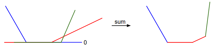 Since these examples are 1-dimensional, the data \(x_i\) and weights \(w_j\) are numbers. Looking at, for instance, \(w_0\), some terms above are linear functions of \(w_0\) and each is clamped at zero. We can visualize this as follows: